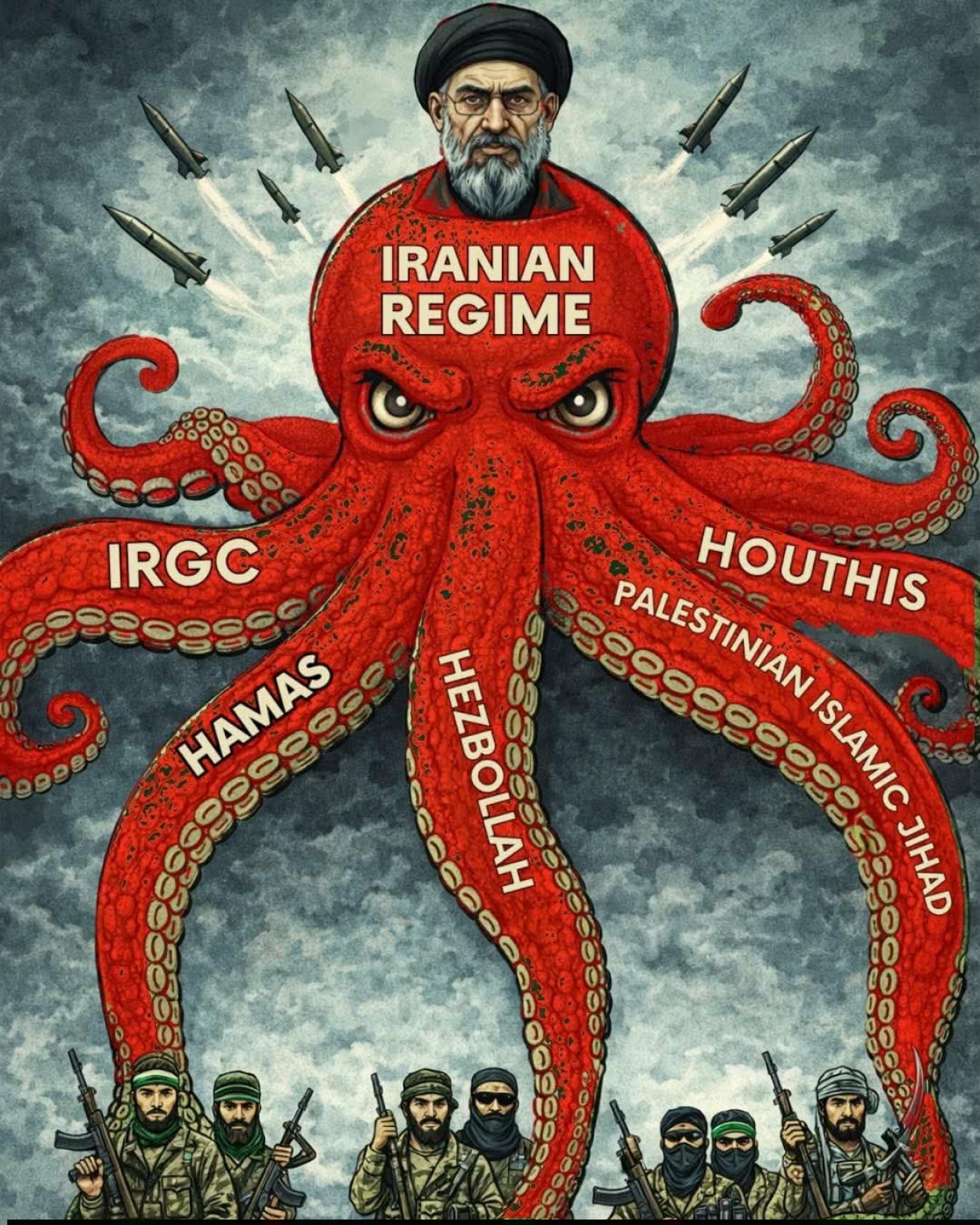 Ιδιαίτερη εντύπωση όμως, μας έκανε μια αφίσα που κυκλοφόρησε πριν από λίγες ημέρες από την Ισραηλινή πρεσβεία και η οποία παρουσιάζει το Ιράν ως απειλητικό χταπόδι που τα πλοκάμια του απλώνονται σε όλη τη Μέση Ανατολή